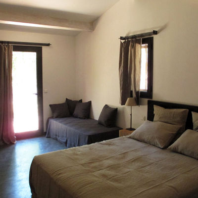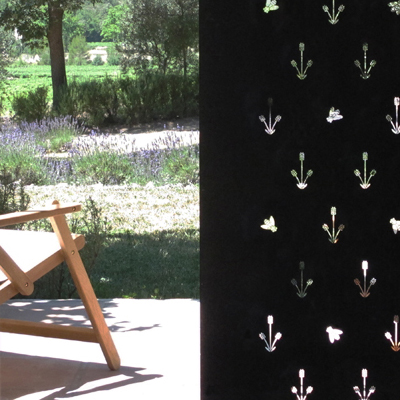 Lavender covers the countryside around the Sénanque abbey. Therefore it is the color of the room. The shutter and the lighting in the room Sénanque suggest the decoration of the abbey: lavender stems and humming bees.