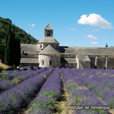 L’Abbaye de Sénanque, retirée dans un vallon de la Sénancole, est un joyau architectural de l'art roman, entourée de champs de lavandes.