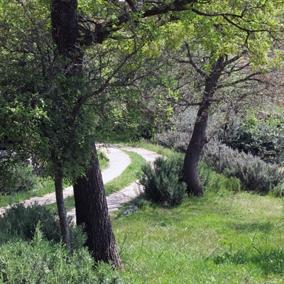 Au delà de la baie de votre chambre, une terrasse privative ombragée, puis les arbres et leurs bosquets de plantes méditerranéennes vous invitent à découvrir pas à pas, l'ensemble du vallon.